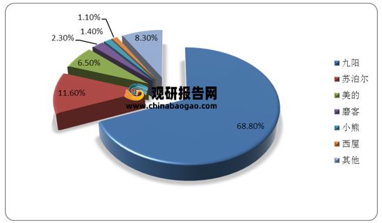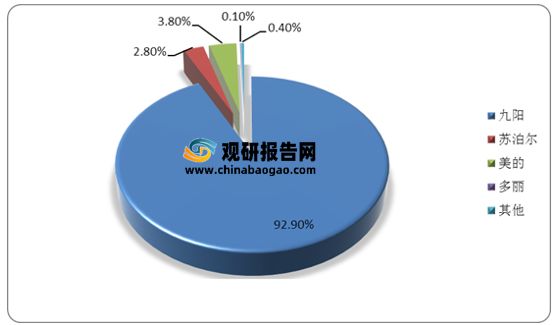 资料来源:观研天下整理 二、豆浆机行业产业链中游 我国豆浆机行业产业链中游即豆浆机生产制造行业。由于豆浆机这一传统小电器品类发展较为成熟,红利逐渐消退,市场规模呈负增长状态。2017-2020年,豆浆机销量由603.63万台下滑至555.13万台,对应的销售额由22.47亿元下降至18.34亿元。 2017-2020年我国豆浆机销量 ![]() 数据来源:观研天下整理 2017-2020年我国豆浆机销售额 ![]() 数据来源:观研天下整理 目前中国豆浆机市场集中度非常高,已经形成赢者通吃格局。2020年九阳在国内豆浆机市场稳居**,线上零售额占比68.8%,线下占比92.9%,拥有绝对的竞争优势。 2020年我国豆浆机线上零售额占比 ![]() 数据来源:观研天下整理 2020年我国豆浆机线上零售额占比 ![]() 数据来源:观研天下整理 2、我国豆浆机行业产业链中游代表企业 现阶段,我国豆浆机行业产业链中游代表企业有九阳股份有限公司、浙江苏泊尔股份有限公司、惠而浦(中国)股份有限公司和广东美的电器股份有限公司等。 我国豆浆机行业产业链中游代表企业优势分析
